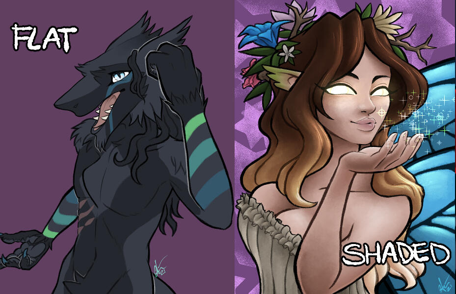 The base price includes 2 full-body poses (eg. front and back) and 2 detail shots (eg. face markings, special anatomy, important accessories), a color palette, and a simple backgroundFlat color - $150+